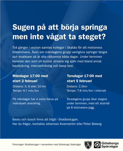Ett nytt år är kommet och snart tar årets VT för löpning vid. under förra året växte grupperna och det är nu ett stadigt och gött gäng som är uppe både Måndag och Torsdag och springer. Men vi vill bli fler, så tveka inte, boka in dagarna och följ med ut i löpspåret!